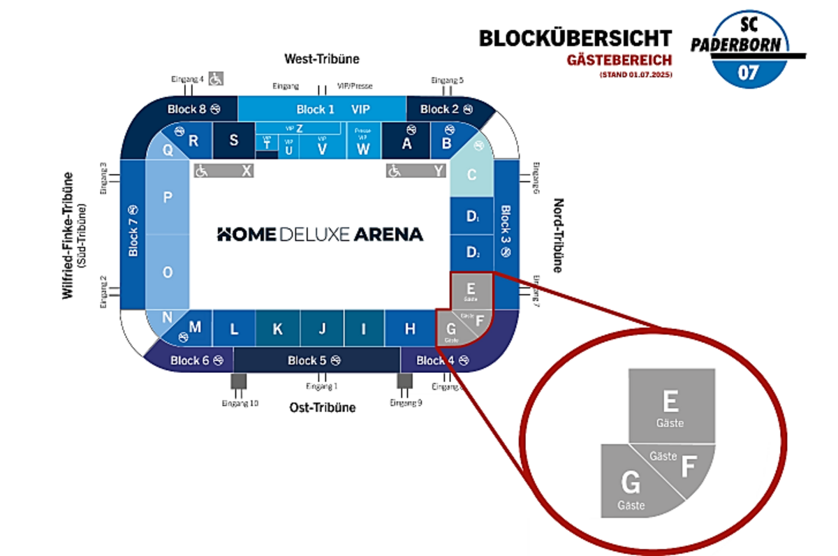 Hinweis: In den angrenzenden Blöcken C und D1 und D2 (Heimbereich) erhalten Zuschauer mit Fankleidung des Gästevereins keinen Zutritt zum Block und werden abgewiesen.