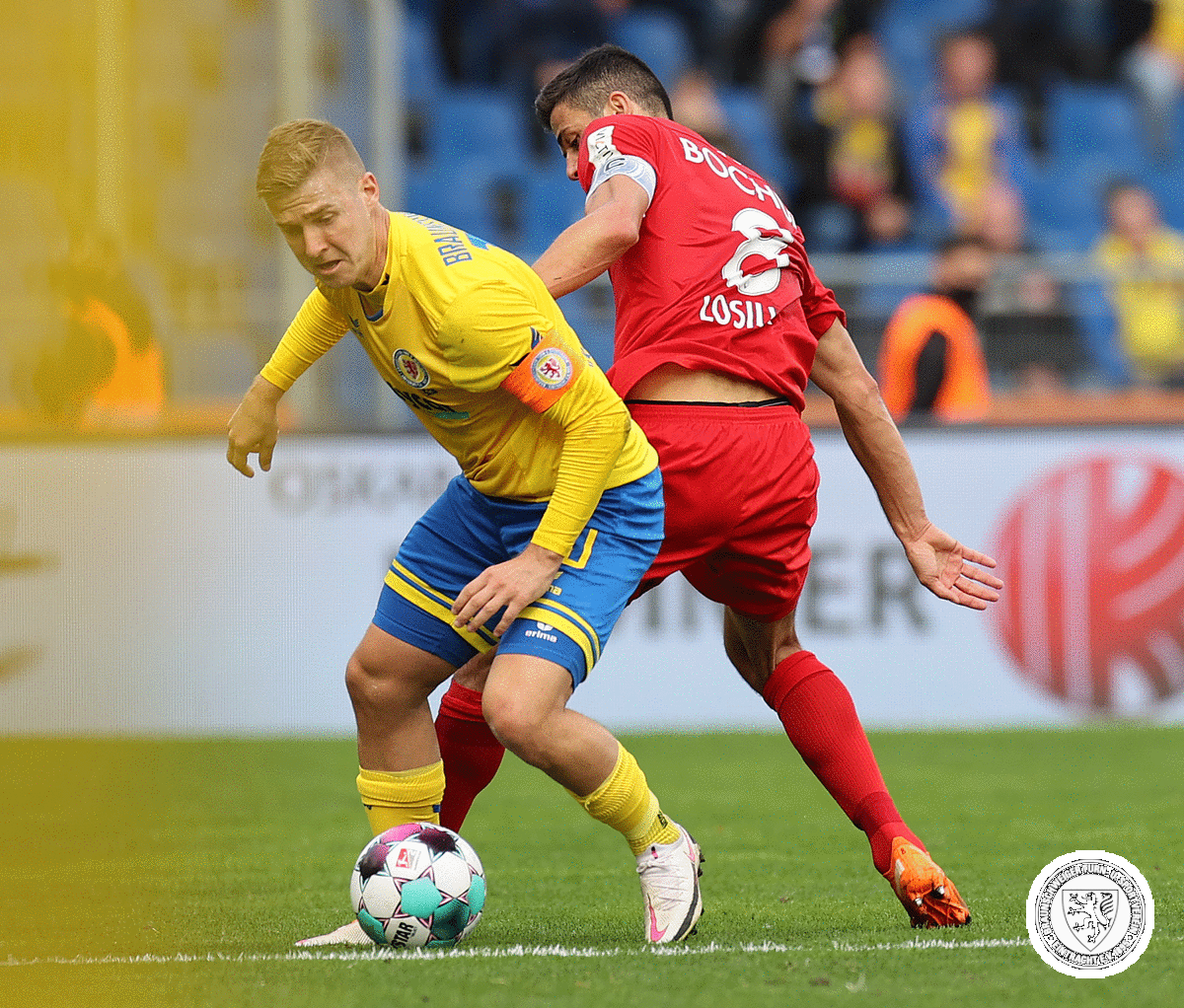 26. Minute: Die Blau-Gelben wollen mehr! Über Ben Balla landet das Spielgerät bei Wiebe, dessen Pass zur Ecke geblockt wird. Kobylanski legt sich das Leder zurecht, Nikolaou verpasst nur haarscharf im Zentrum, puh!