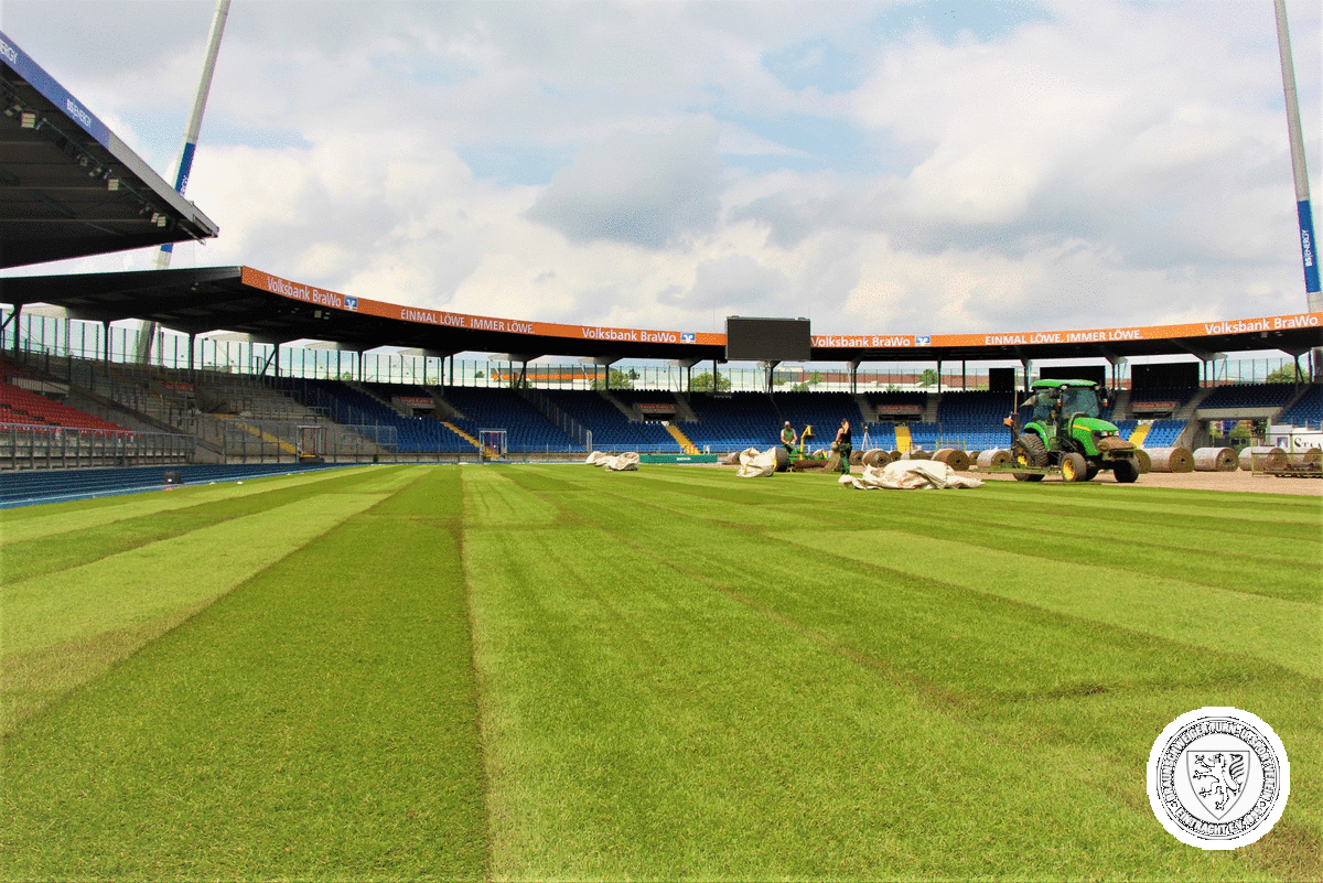 Eigentlich wäre es im vergangenen Jahr bereits Zeit für einen Rasenwechsel gewesen, doch das Pandemiegeschehen verhinderte die Durchführung. Zudem verzögerten Großveranstaltungen im Stadion, darunter die Deutsche Meisterschaft in Leichtathletik und die letzten Partien des Footballteams der New Yorker Lions, den Startzeitpunkt des Verlegens auf die vergangene Woche. Nun ist es aber endlich soweit: der neue Belag, bestehend aus einer besonders belastbaren Poa Pratensis-Mischung, ist fertig verlegt und wächst nun an. Im ersten Drittliga-Heimspiel der Löwen am Sonntag, bei dem Viktoria Berlin an der Hamburger Straße zu Gast ist, wird die neue Spielunterlage dann direkt dem ersten Härtetest unterzogen.
