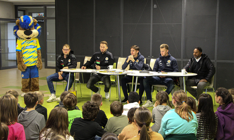 Marc Pfitzner, Mehmet Ibrahimi und Lennart Schulze Kökelsum überraschen Fünftklässler